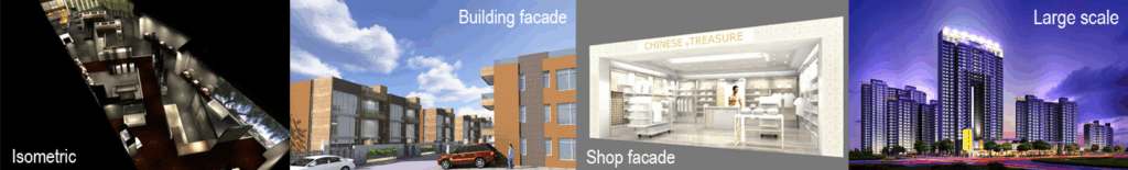 イソメトリック(鳥瞰)、ビル一棟外観、各種ファサード及び大規模プロジェクトについてはご相談後お見積もりさせていただきます。